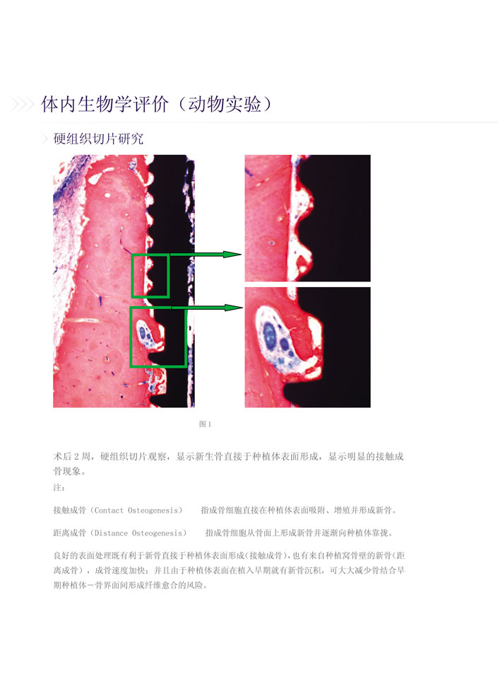 硬組織切片研究結(jié)果:術(shù)后2周,硬組織切片觀察,顯示新生骨直接于種植體表面形成,顯示明顯的接觸成骨現(xiàn)象。術(shù)后4周,硬組織切片觀察顯示種植窩-骨界面間骨結(jié)合良好。