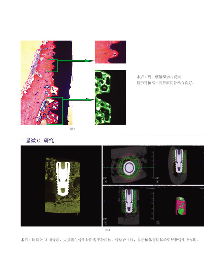 顯微CT研究結(jié)果:術(shù)后4周顯微CT圖像示,大量新生骨生長附著于種植體,骨結(jié)合良好,顯示植體有明顯的引導(dǎo)新骨生成作用。